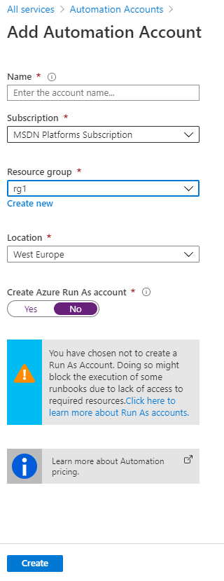 New-AzAutomationAccount -Name Automation1 -ResourceGroupName rg1 -Location westeurope