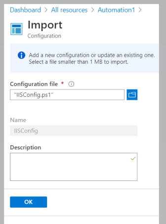 Import-AzAutomationDscConfiguration -AutomationAccountName "Automation1" -ResourceGroupName "rg1" -SourcePath ".\IISConfig.ps1" -Published