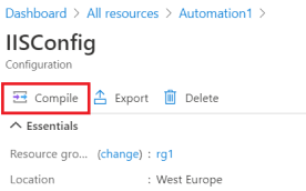 Start-AzAutomationDscCompilationJob -ConfigurationName IISConfig -ResourceGroupName rg1 -AutomationAccountName Automation1