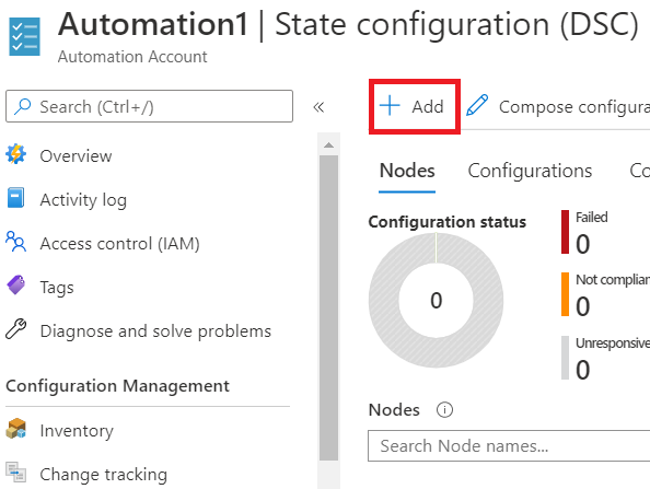 In the “State Configuration (DSC) blade, navigate to “Nodes” and click “Add”.