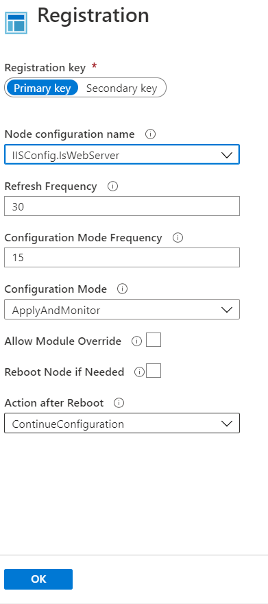 Register-AzAutomationDscNode -AutomationAccountName Automation1 -AzureVMName vm1 -ResourceGroupName rg1 -NodeConfigurationName "IISConfig.IsWebServer" -ConfigurationMode ApplyAndMonitor -RefreshFrequencyMins 30 -ConfigurationModeFrequencyMins 15