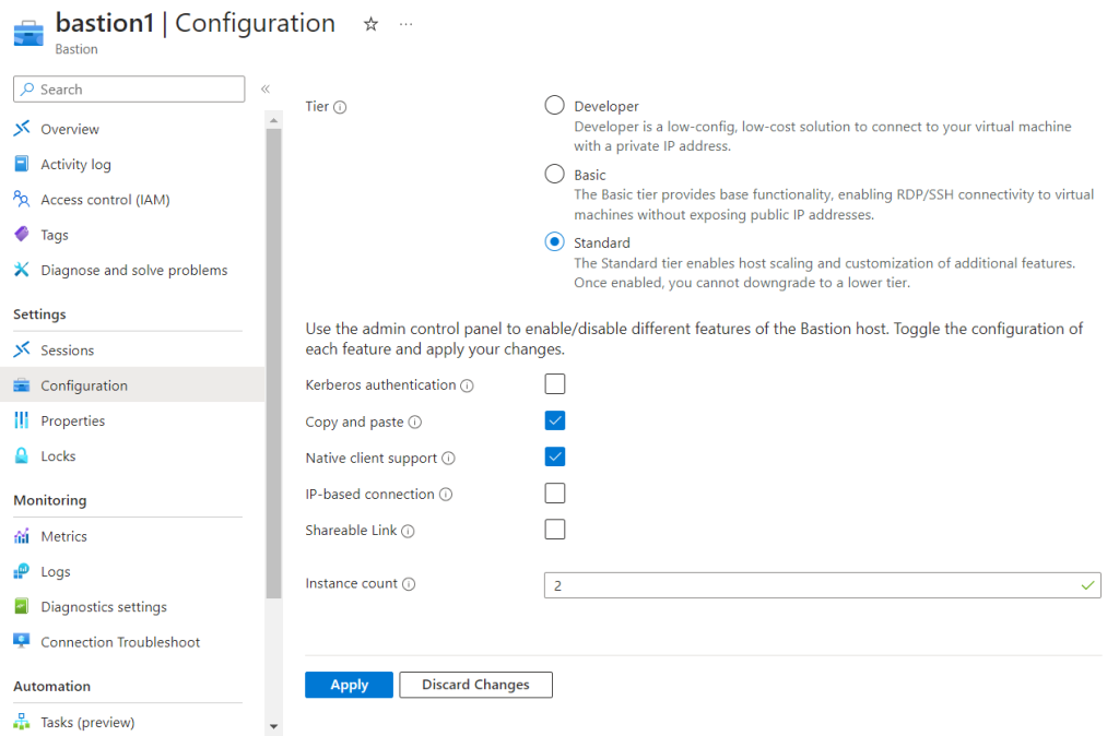 For the file upload feature to work, your Bastion host must be on the Standard tier and the “Native Client Support” option must be enabled. To do this on the Azure Portal, navigate to your Bastion host resource and under “Settings” select the “Configuration” option. In this page, ensure that the “Standard” tier is selected and the “Native Client Support” box is checked.
